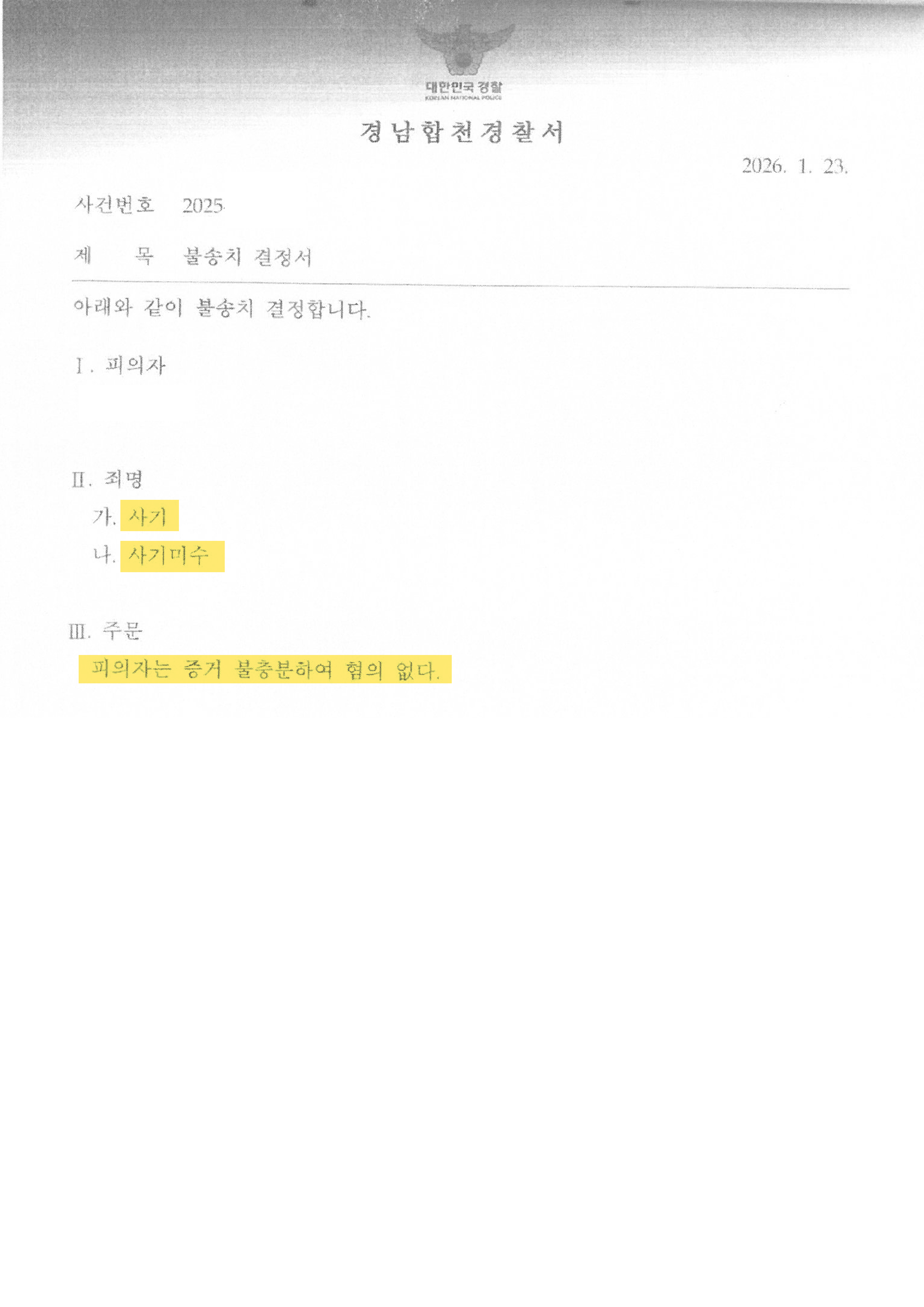 수사기관은 형법 제347조(사기)적용 여부를 검토한 결과, 기망행위를 인정할 증거가 부족하고 본 사안이 민사상 분쟁에 해당한다고 보아 혐의없음(불송치)결정을 하였습니다.