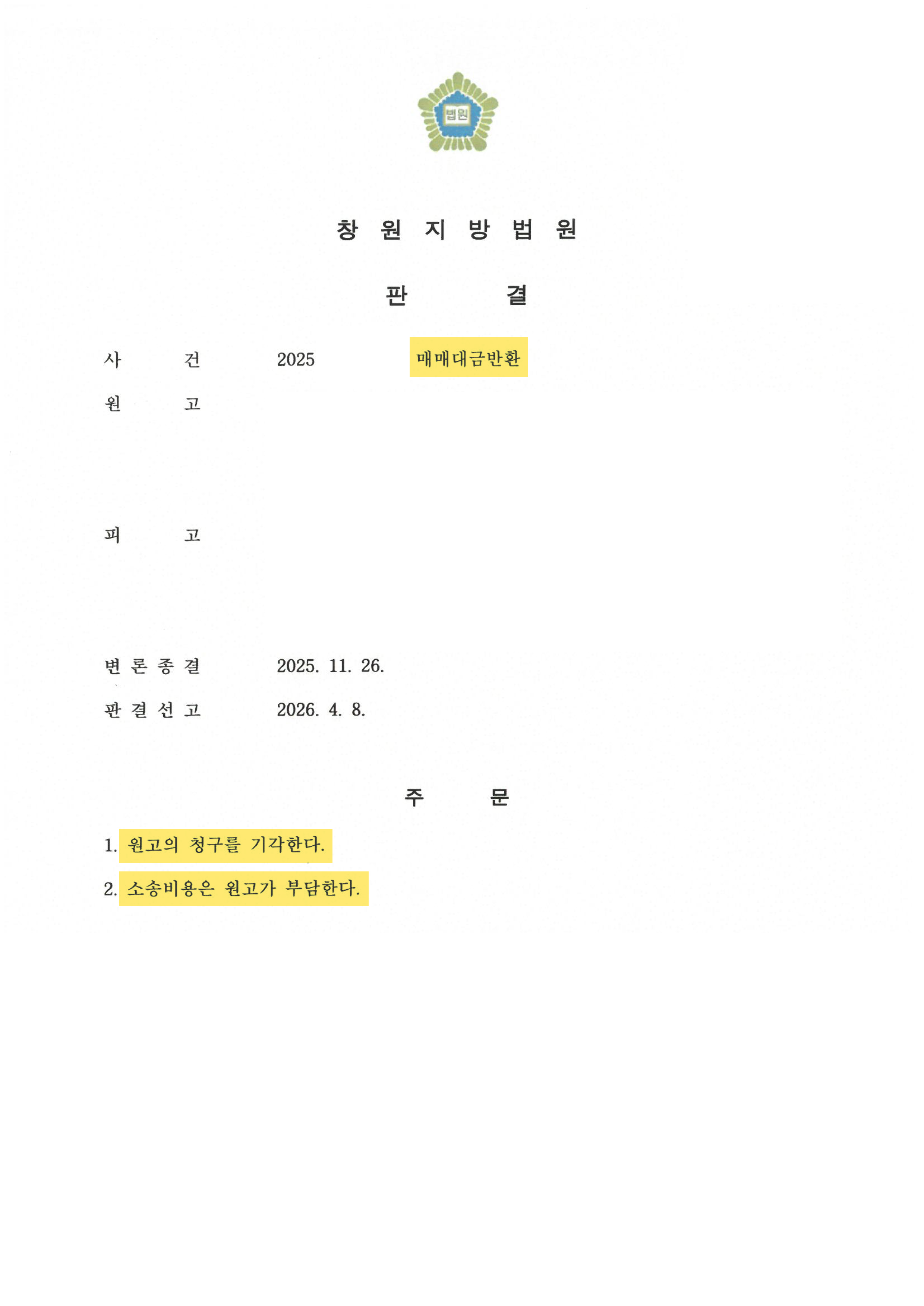 이에 따라 원고의 매매계약 취소 및 대금반환 청구를 전부 기각하는 판결을 선고하였습니다.
