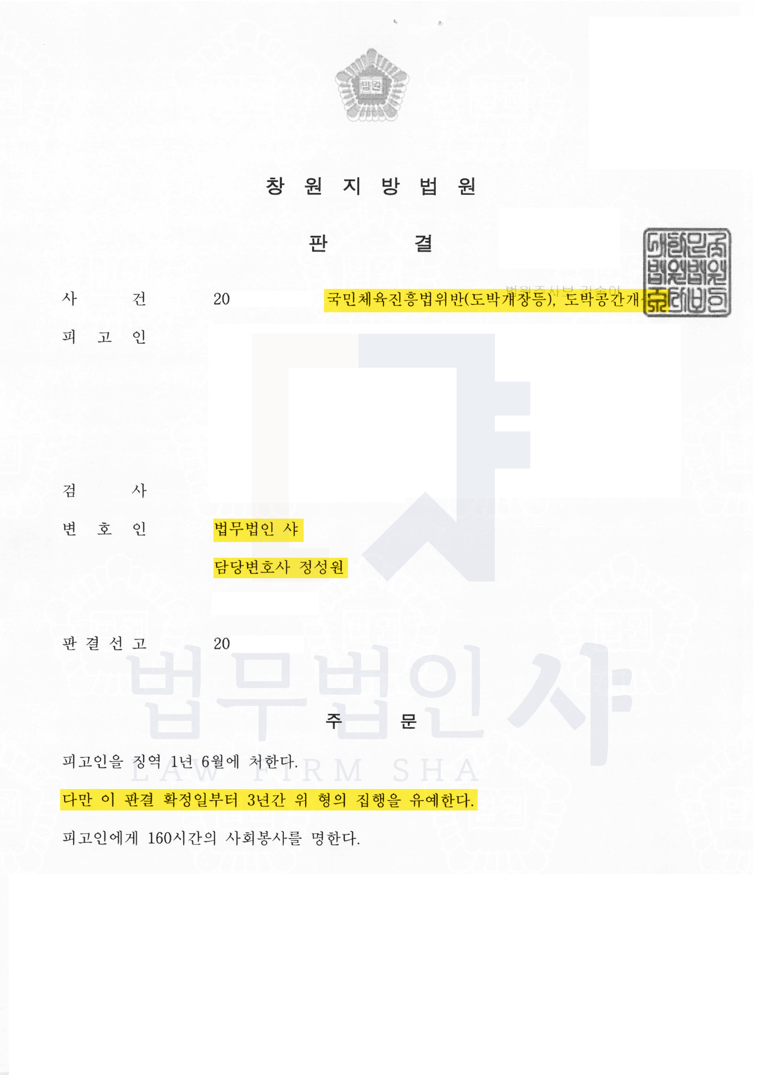 법원은 변호인의 주장을 그대로 인정하여 수사기관에서 인정하지 아니한 자수를 인정하여 특별양형인자로 고려하였고, 매우 거액 도박사이트의 최상위 총판이었음에도 징역 1년 6월, 집행유예 3년을 선고하였습니다.