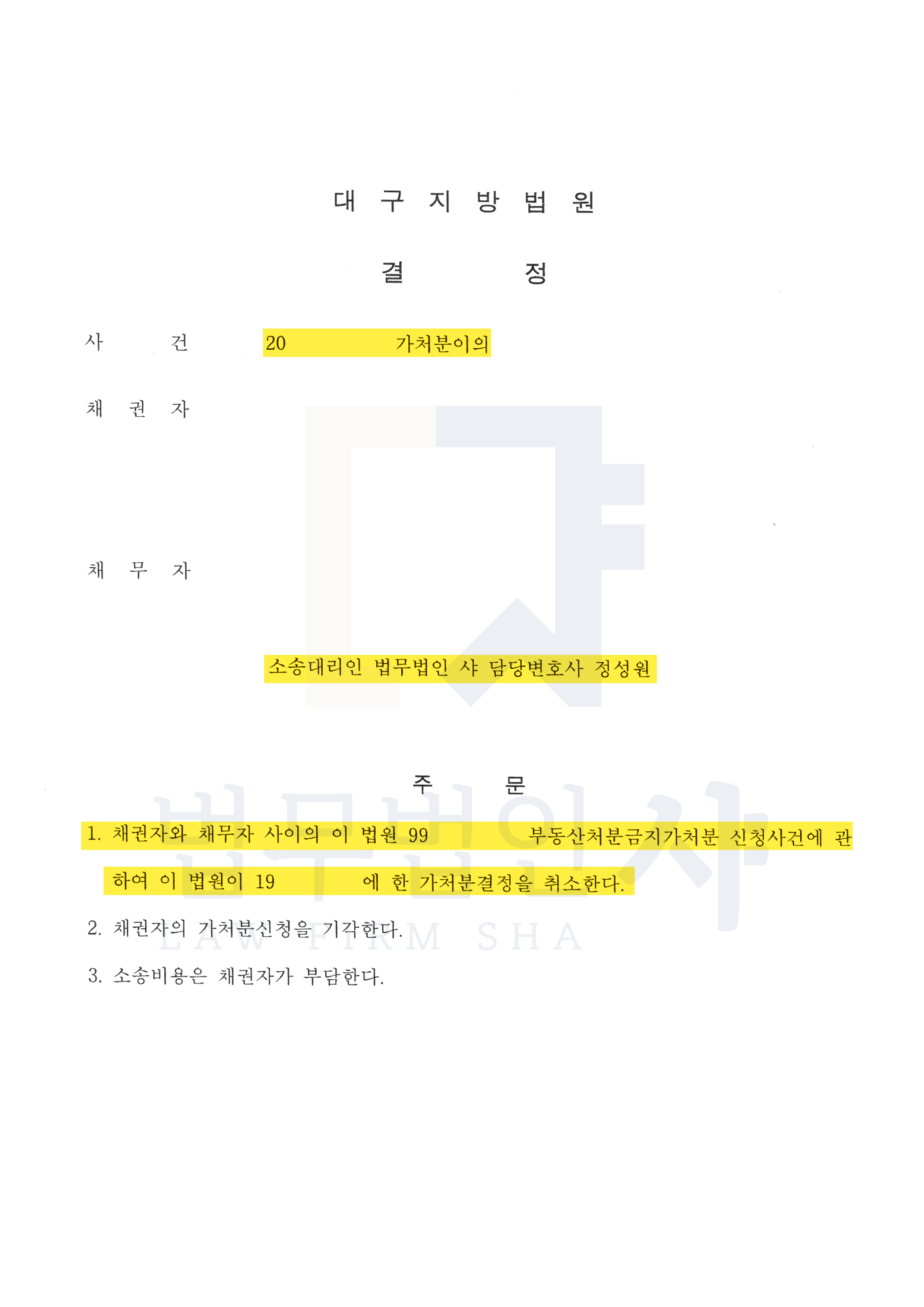 법원은 변호사의 주장을 그대로 받아들여 채권자의 부동산 처분금지가처분결정을 취소하고,