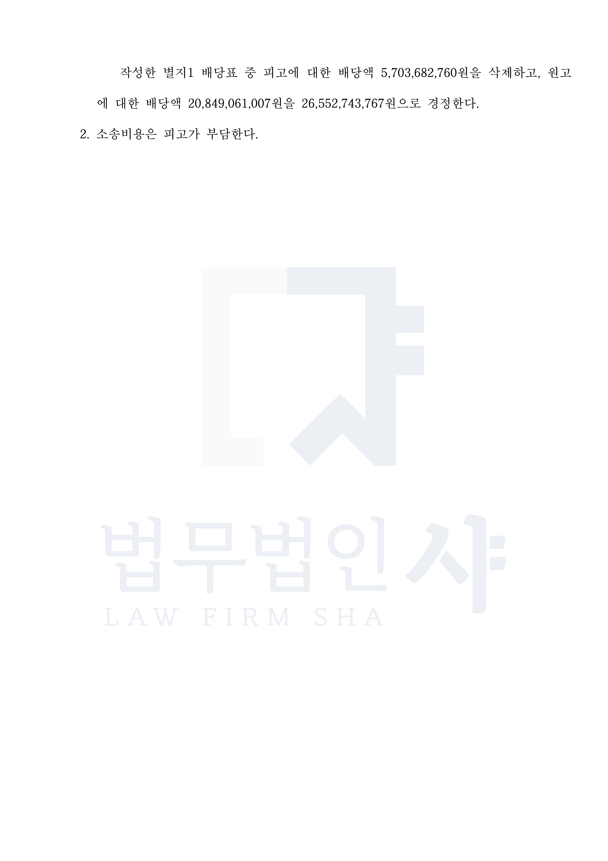 신탁사가 지출한 부가가치세 등 제세금 또는 부담금은 이미 지출한 비용인지 확인 할 수 없고, 소송비용, 강제집행 절차를 위한 공탁금 등은 신탁재산 자체의 보존 및 관리를 위해 지출한 공익적 비용이라고 볼 수 없다며 신탁사의 배당표 중 57억 원을 삭제하고 원고의 배당액 중 57억 원을 추가하여 265억 원으로 경정하는 판단을 하였습니다.